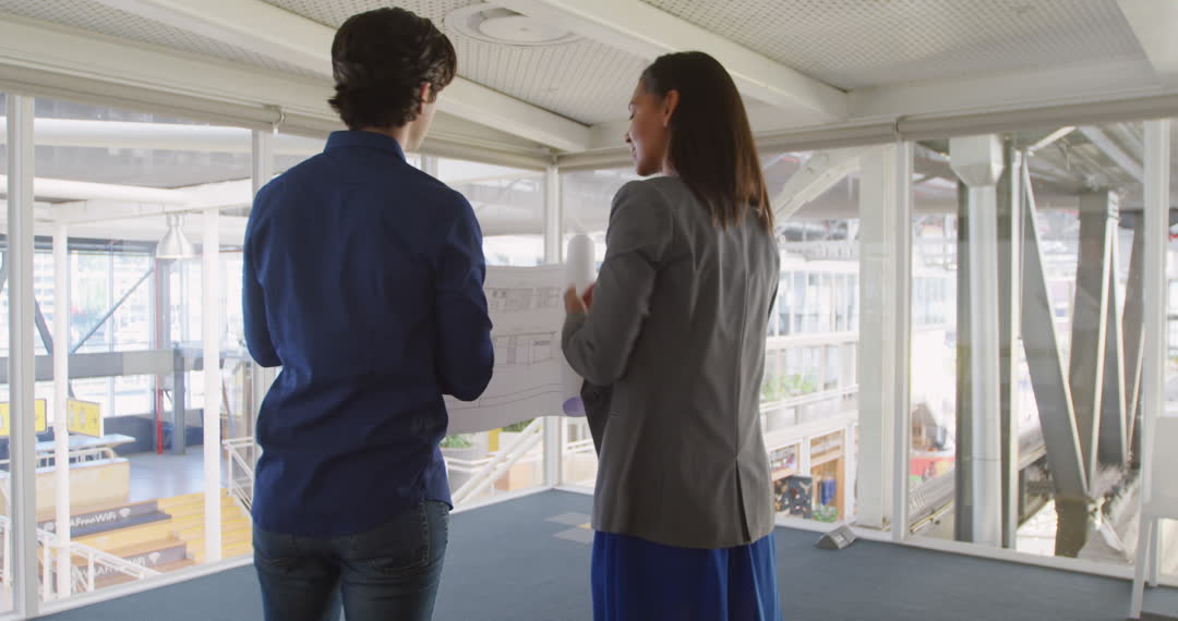 Two business professionals, a young Caucasian male and a biracial female, are deeply engaged in analyzing architectural plans in a sleek, contemporary office environment. This setting conveys collaboration, innovation, and forward-thinking in a dynamic business context. Ideal for depicting teamwork, modern work practices, or business planning scenarios. Useful for materials in architecture, business development, or teamwork promotion.