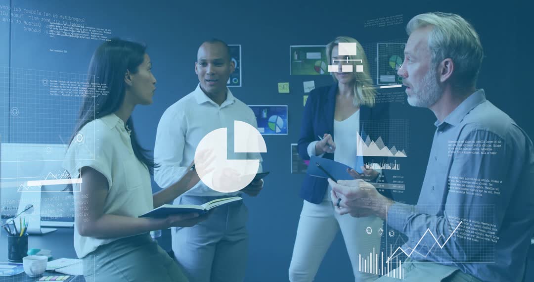 - Business Team Discussing Data Analytics with Overlay Graphics