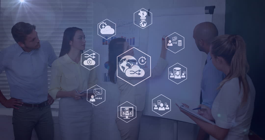Business professionals analyzing a strategy with digital transformation icons overlay. This is ideal for illustrating modern corporate culture, teamwork in tech-driven industries, and presentations on innovation integration in business environments.