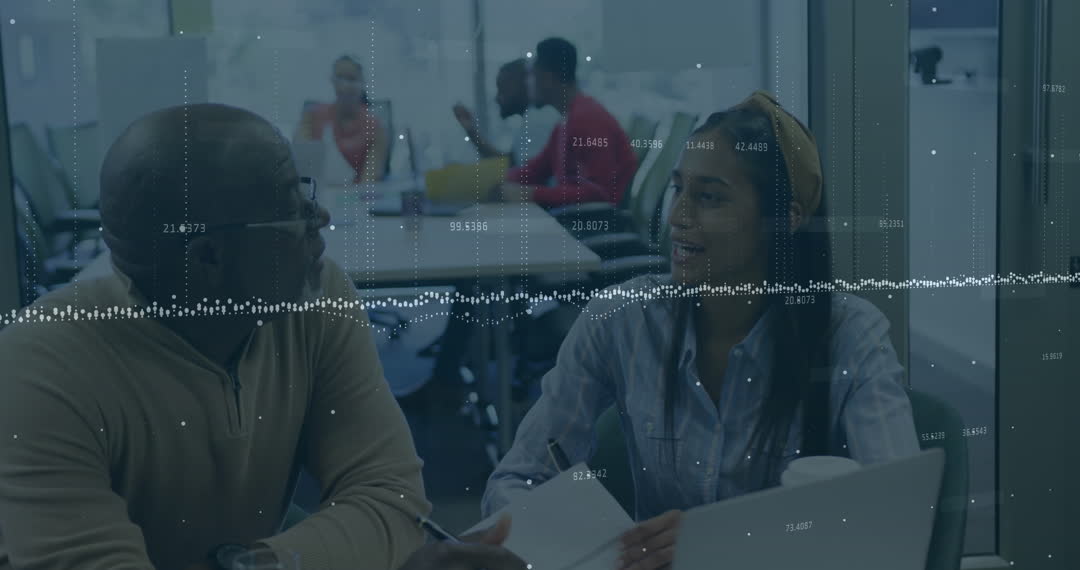 Team in office environment discussing financial data with statistical graphs overlay. Suitable for content on teamwork, financial analysis, diverse teams in business, corporate settings, presentations on economic trends.