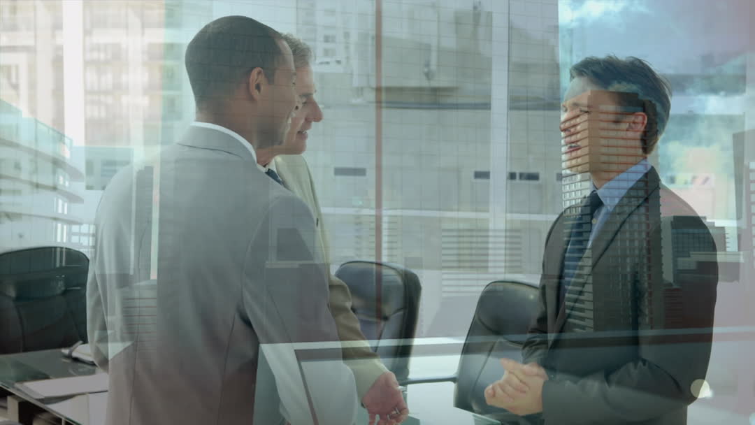Group of businesspeople engaged in discussion, with financial data overlays, conveying teamwork and decision-making in a corporate setting. Ideal for use in content related to business strategy, financial analytics, digital transformation in business, and collaborative work environments.
