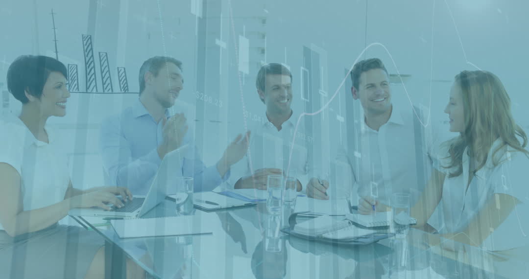 - Business Team Discussing Fintech Strategies with Data Overlay