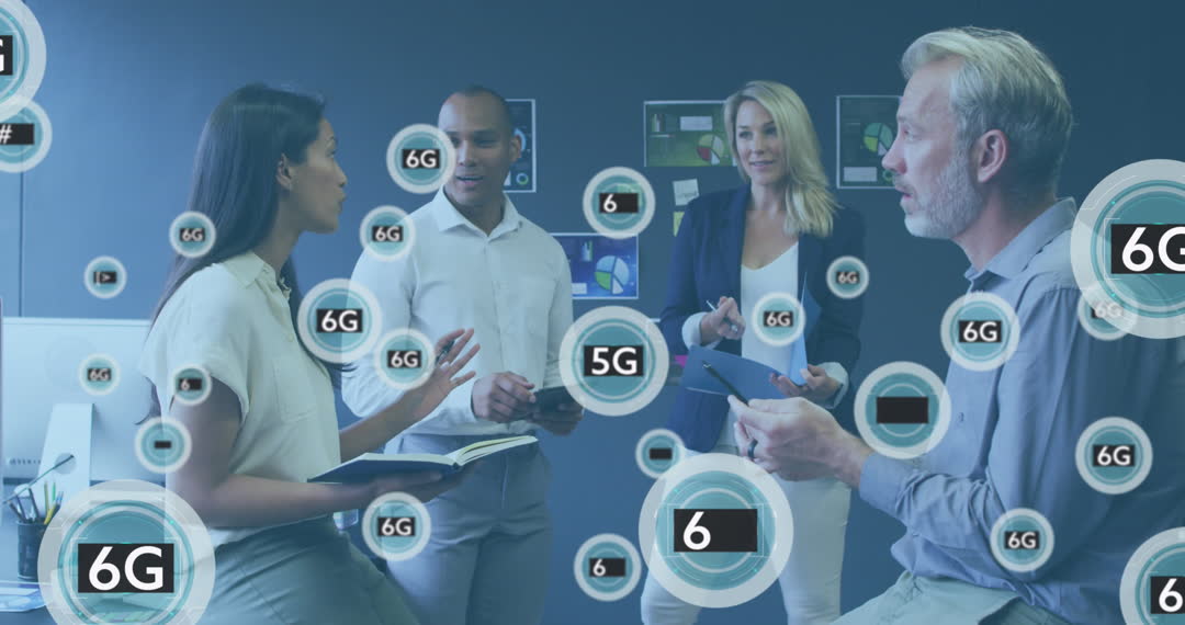 Diverse group of colleagues in an office environment discussing advancements in 6G technology. Digital 6G and 5G text elements overlay video, depicting focus on cutting-edge communication solutions. Ideal for illustrating concepts of innovation in tech, future of networking, or team-based corporate work.