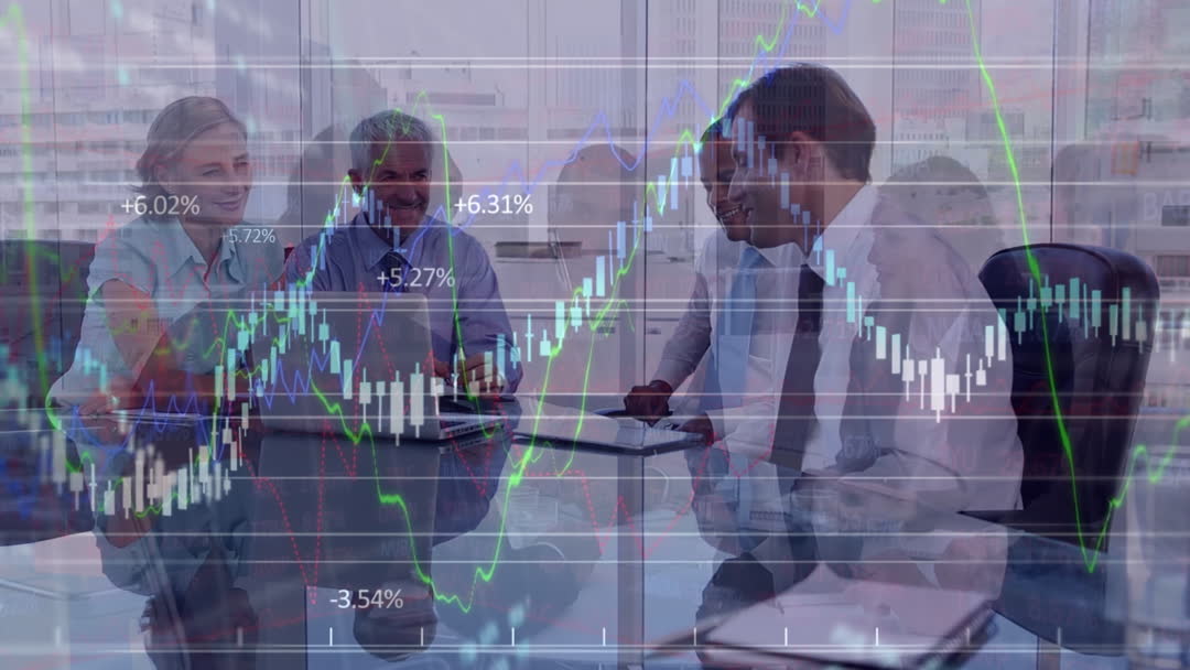 Business professionals collaborate around a table with overlay of financial graphs and data, suggesting topics like market trends and analysis. Useful for illustrating modern business strategies or financial consultancy concepts.
