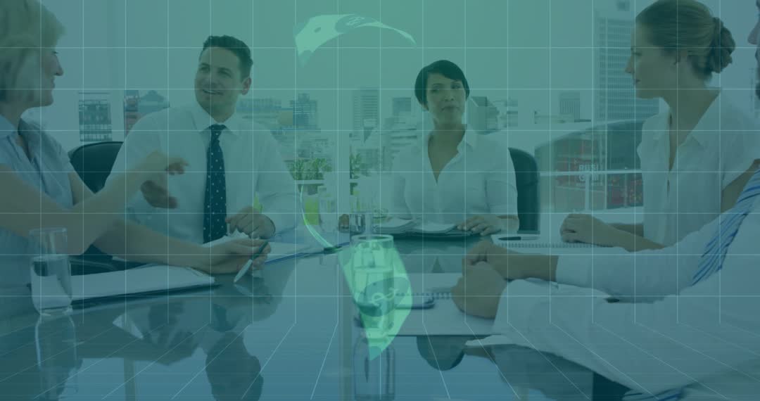 Business professionals in a modern office setting discussing strategy while a digital globe animation overlays the scene. Perfect for illustrating concepts of global business, technology integration, innovation, and teamwork. Suitable for presentations, business blogs, or corporate websites aiming to convey advancing in global communications and innovative solutions.