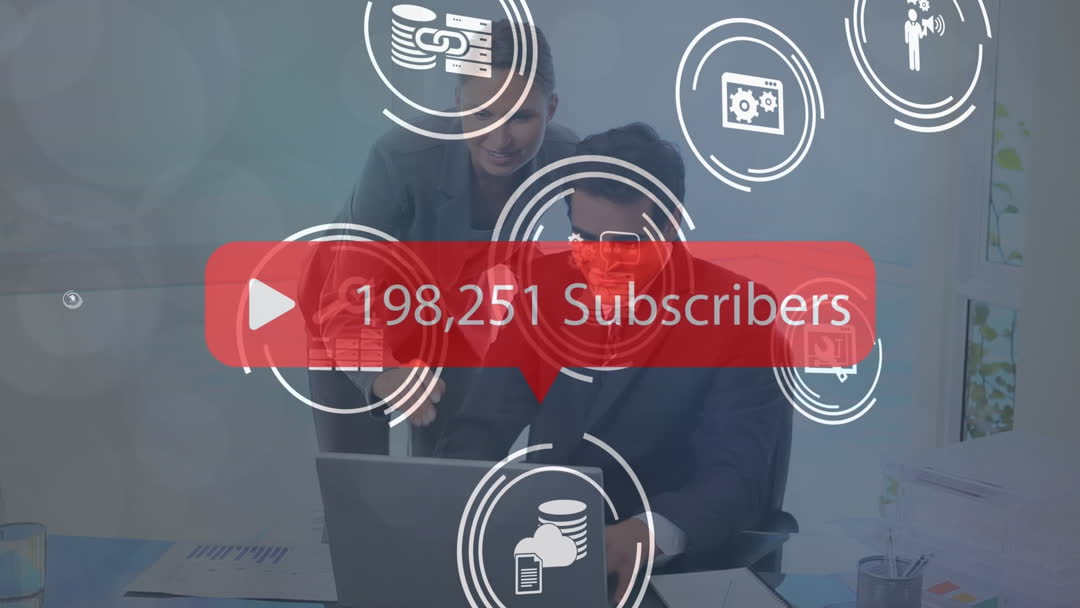 Business professionals in a modern office environment surrounded by digital icons representing network connections and subscribers. This conveys teamwork and technology integration in corporate settings. Suitable for illustrating ways businesses can expand their digital footprint and improve collaboration.
