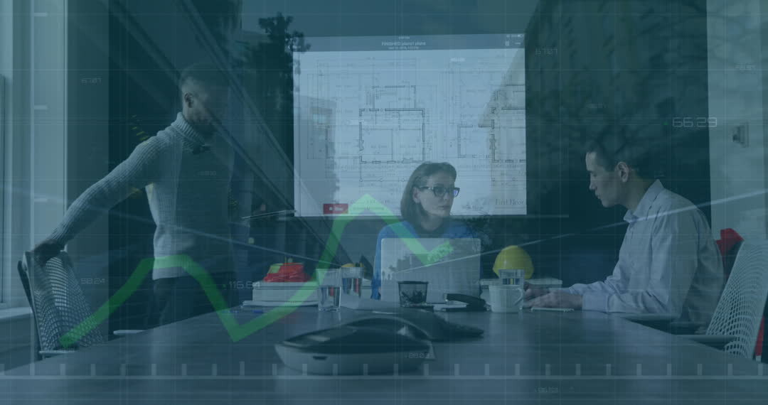 - Business Team Discussing Strategy with Graphical Data Overlay