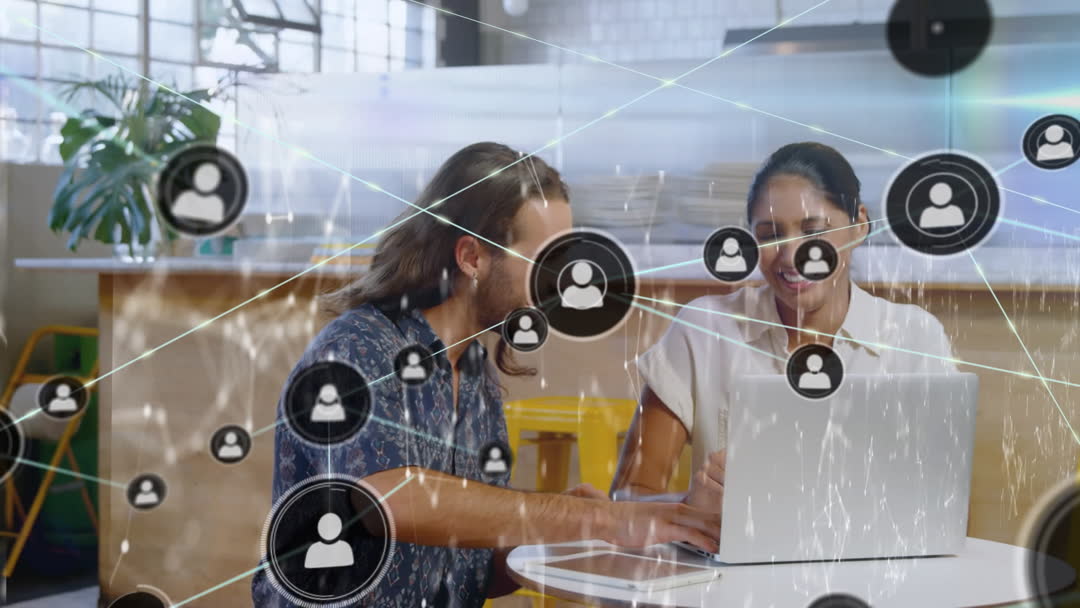 Showing two coworkers interacting with a laptop, highlighting modern teamwork in a connected digital space. Network symbols overlaying gestures global connections, ideal for illustrating concepts of network, collaboration, and technology advancements in professional settings.