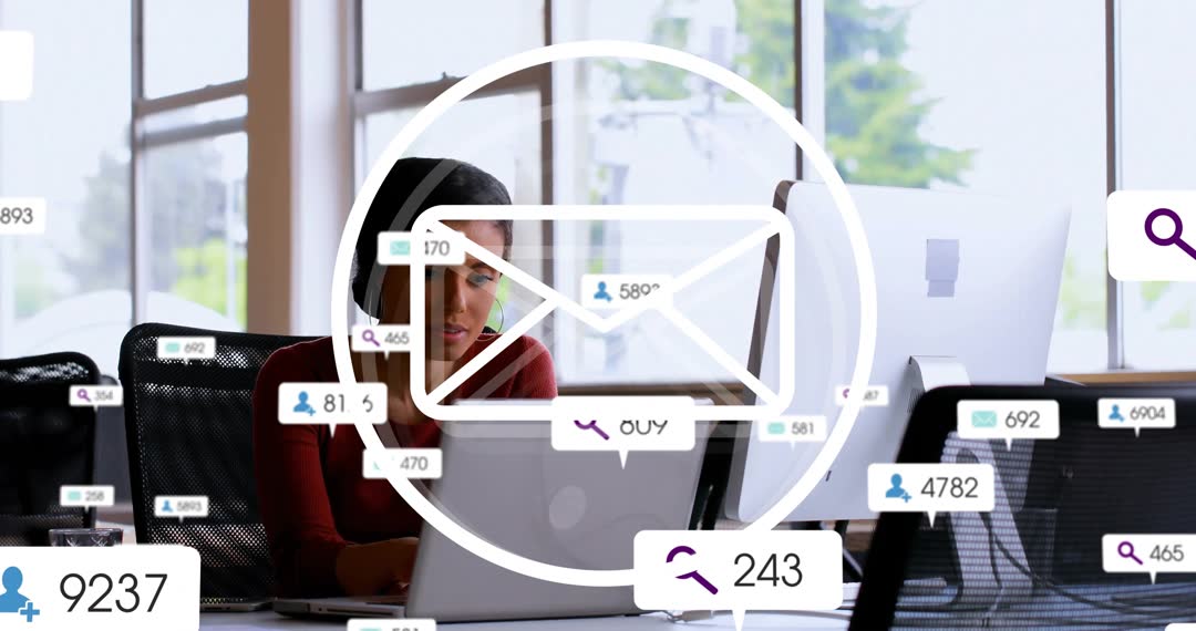Business professionals working on laptops in a technology-equipped office filled with digital notifications add a dynamic touch to modern office setups. Suitable for illustrating contemporary communication in the workplace, digital teamwork strategies, and the importance of virtual networking. Useful for blog posts, corporate presentations, and articles focusing on modern work environments or remote team collaboration.