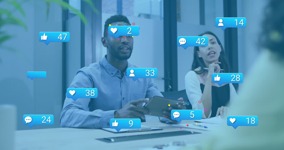 Depicts diverse business professionals in a meeting with animated social media icons overlay. Ideal for illustrating digital marketing strategies, social media engagement concepts, modern business environments, or teamwork and collaboration in the workplace.