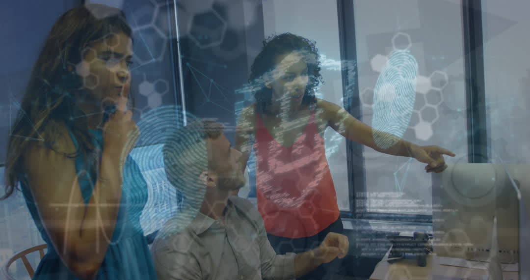 Business team appearing frustrated with overlapping digital security graphics and data streams symbolizes the challenges in cybersecurity and information technology. It infers concepts such as online security measures, team strategy, and business solutions. Useful for articles or presentations on digital security, teamwork in tech companies, and data protection challenges.