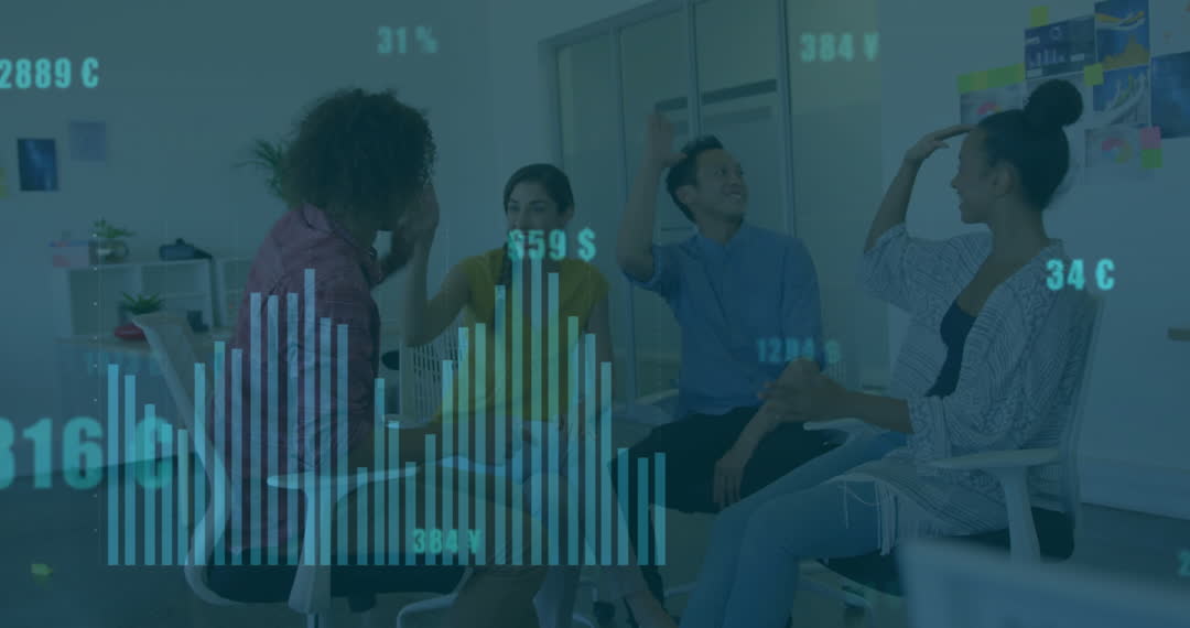 Business coworkers engaged in a lively discussion, celebrating with high fives. Graph overlays suggest topics related to finance, growth, and teamwork fostering a dynamic office environment. Useful for illustrating themes of business success, cooperative working strategies, and economic growth.