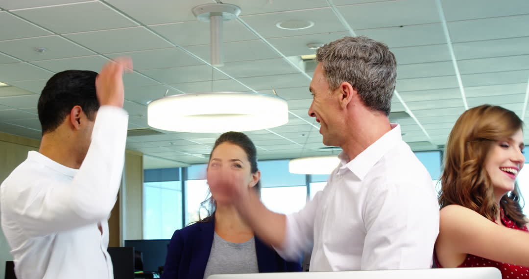 Business professionals are celebrating a success in a contemporary office environment by sharing high-fives and smiles. This video is an excellent representation of teamwork, success, and positive workplace dynamics, making it suitable for publications covering business communication, leadership training, or diversity in the workplace.