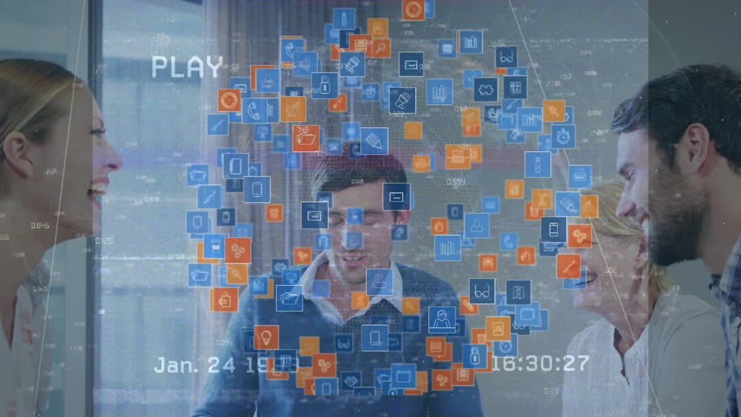 Business Team in Conference with Digital Overlay of Data and Icons Video