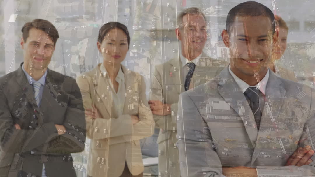 Businesspeople standing confidently with an overlay of digital analytics, representing modern global business environments and technology integration. Useful for depicting futuristic business trends, collaboration, diversity in business settings, and technology advancements. Ideal for articles and presentations focused on innovation, team-building, and digital tools in the workplace.