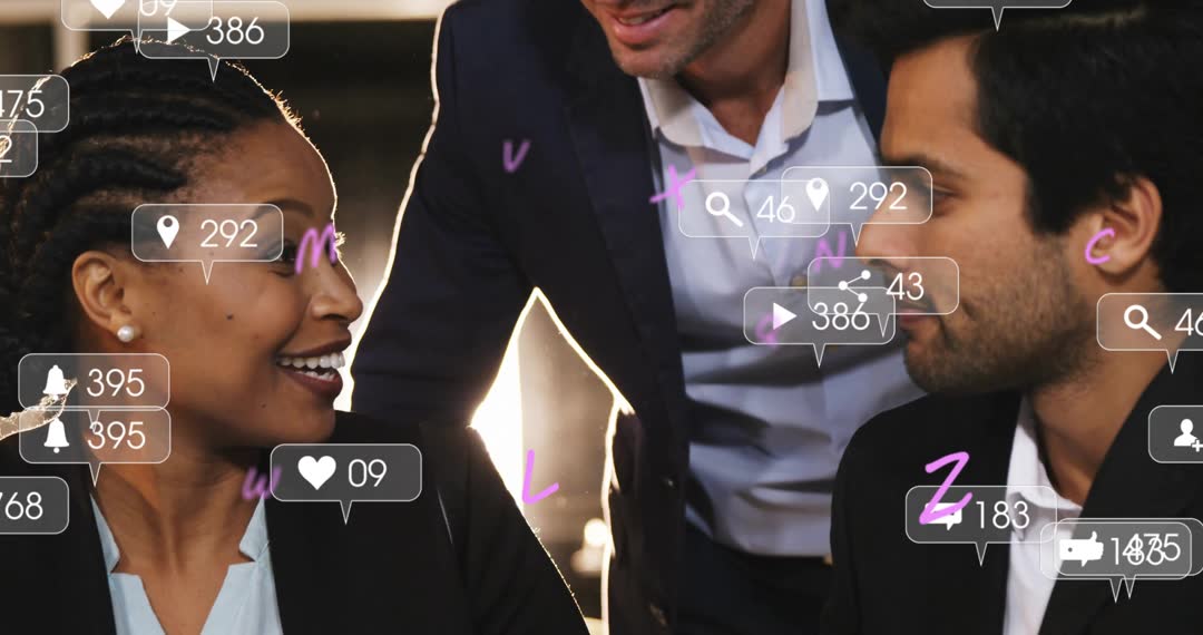 Three professionals leaning over laptop while social media icons, notification bubbles, and numeric metrics float across frame, backlight creating cinematic bokeh. Scene showing collaboration, brainstorming, and data-driven decision making with focus on engagement, follower growth, and performance KPIs. Ideal for using in marketing campaigns, digital strategy presentations, social media ads, website hero clips, corporate training modules, and case study videos. Suggested usage including pairing with headline about leveraging analytics for growth, overlaying key statistics, or cutting into explainer sequences about teamwork and social engagement. Technical notes: using warm backlight, applying moderate contrast, keeping icon overlays semi-transparent for on-screen readability, exporting with high bitrate for smooth motion.