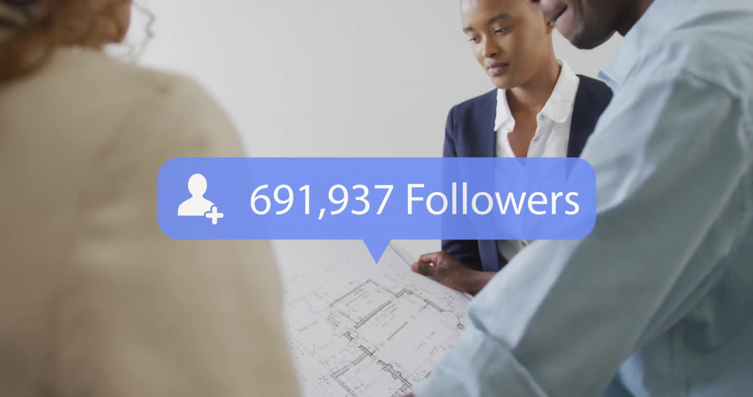 Professionals from a business team are reviewing architectural blueprints, emphasizing collaboration and teamwork. A visual social media notification displays the number of followers, suggesting a connection between architecture projects and digital engagement. Ideal for use in contexts involving architectural planning, construction industry updates, social media marketing in corporate settings, and team-based project execution promotions.