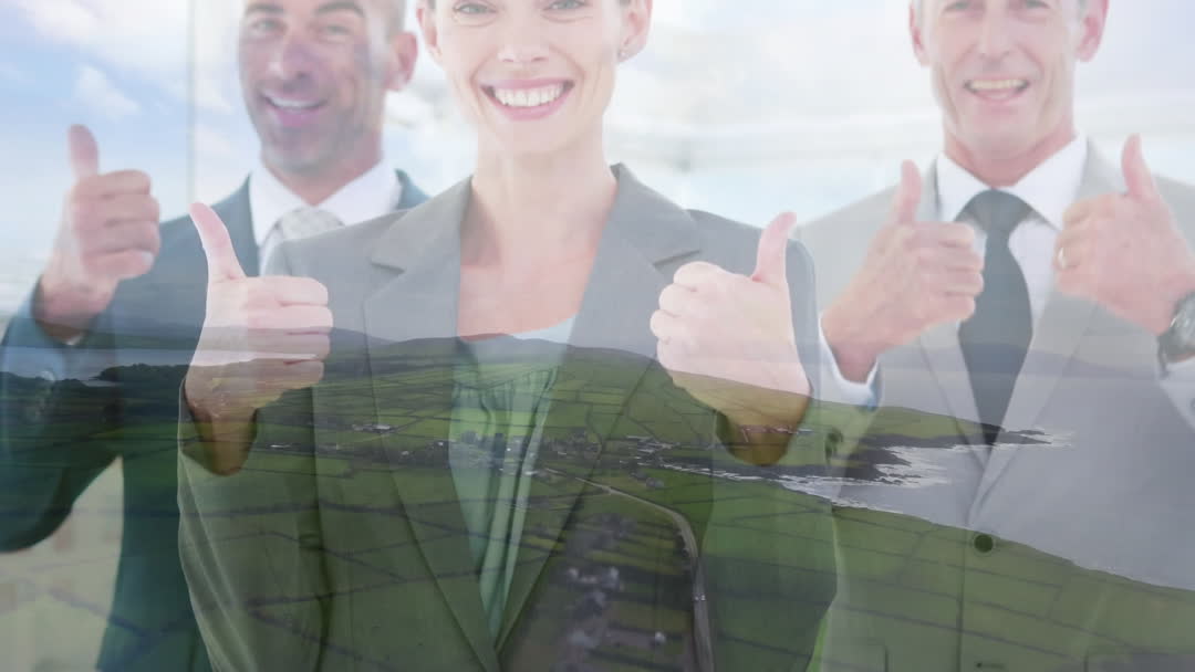 Business professionals displaying thumbs up gesture signify success in bright office setting fused with scenic coastal landscape. Ideal for highlighting teamwork, career success, and positive market outlook. Potential use in promotional material for business excellence, real estate ads, or motivational content.