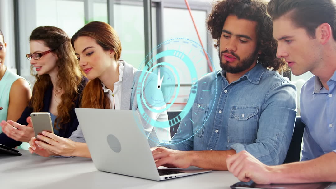 A group of young professionals in an office using a laptop, mobile phone, and digital tablet during a meeting. The setting suggests a modern business environment, highlighting teamwork and the integration of technology into daily workflow. This video is ideal for promoting corporate teamwork, digital communication, and productive work culture in contemporary businesses.