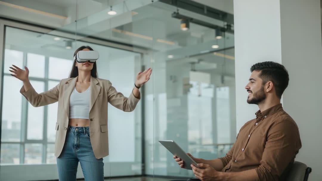 AI Generated Image. Two colleagues engaging in virtual reality technology within a modern office. The standing woman wearing a VR headset interacts with the digital environment, illustrating the application of immersive technology in business. Meanwhile, the seated man observes via a tablet, embodying teamwork and innovation in a professional workspace. Perfect for illustrating futuristic work environments, technology integration, and corporate training utilizing emerging tools.