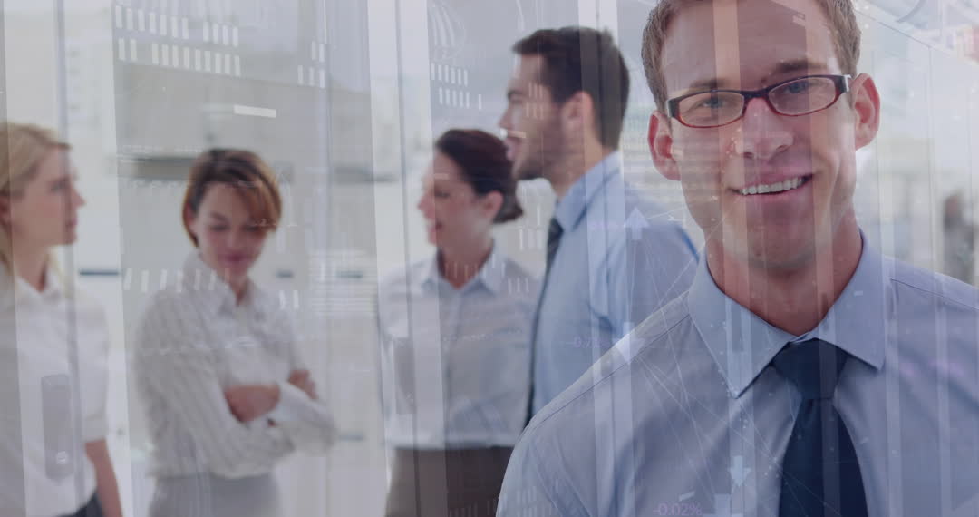 Business Team with Financial Data Overlay in Modern Office Video