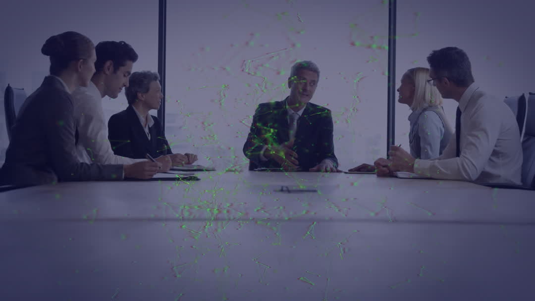 Business professionals are meeting in an office, discussing modern data solutions. Animated digital connections appear on screen, symbolizing global communication and data processing. Useful for showcasing themes of innovation, digital transformation in the corporate world, or illustrations of technology-driven discussion and strategic planning.