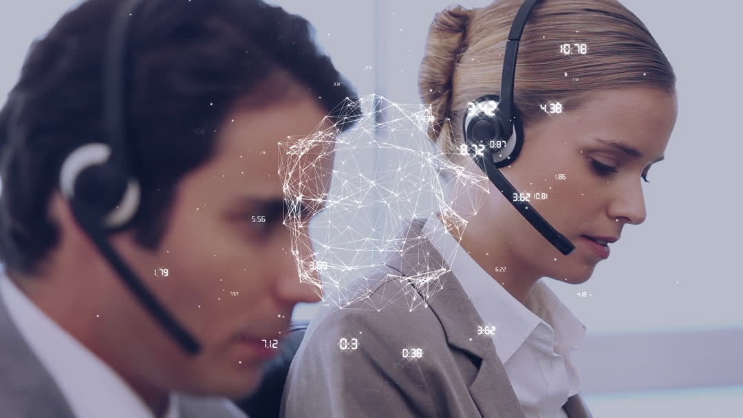 This visual illustrates a call center environment with two business professionals focused on communication tasks while wearing headsets. A digital representation of a globe with interconnected points hovers between them, signifying global reach and network connectivity. This videory underscores themes of worldwide customer support, technological advancements in communication, and teamwork. It can be effectively used in articles or presentations about customer service technology, outsourcing businesses, and global business communications.