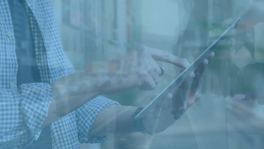 This illustration combines the essence of technology with a bustling business atmosphere, featuring hands operating a tablet alongside silhouettes of people walking. Ideal for marketing materials emphasizing innovation, digital transformation, and global business strategies.