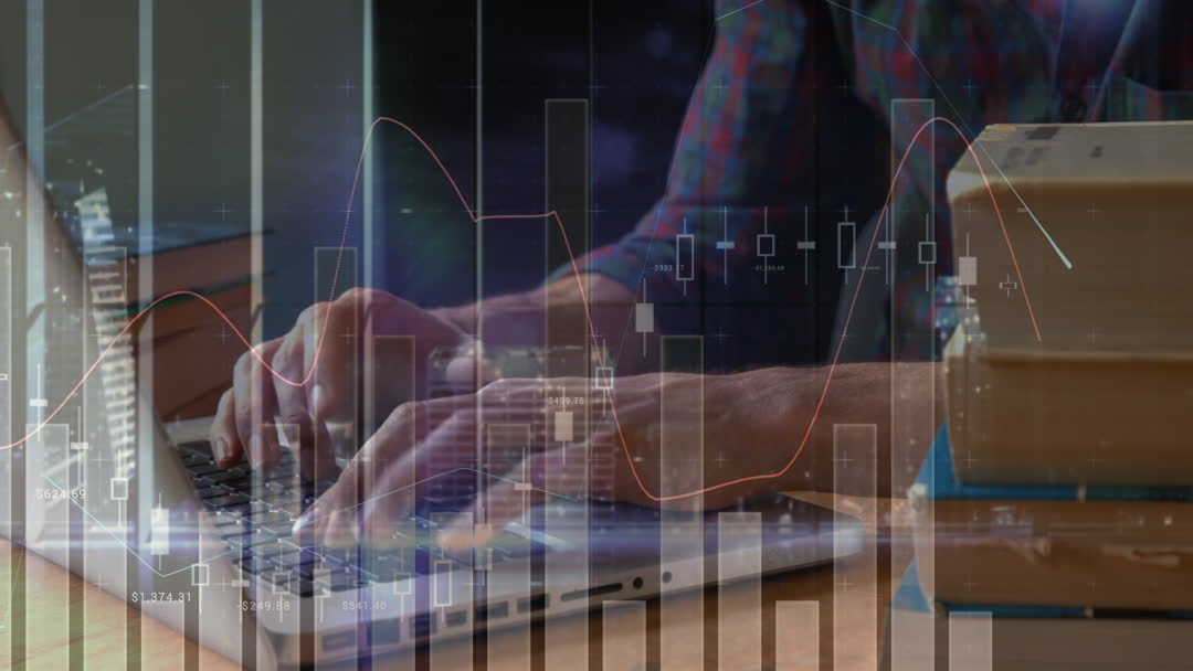 Hands are typing on a keyboard, overlaid with dynamic financial charts and graphs. This can be perfect for illustrating work in financial technology, digital marketing trends, market analytics, and modern business environments. It captures the integration of technology and analytics into daily workflows, also suitable for presentations, reports, or articles on these subjects.