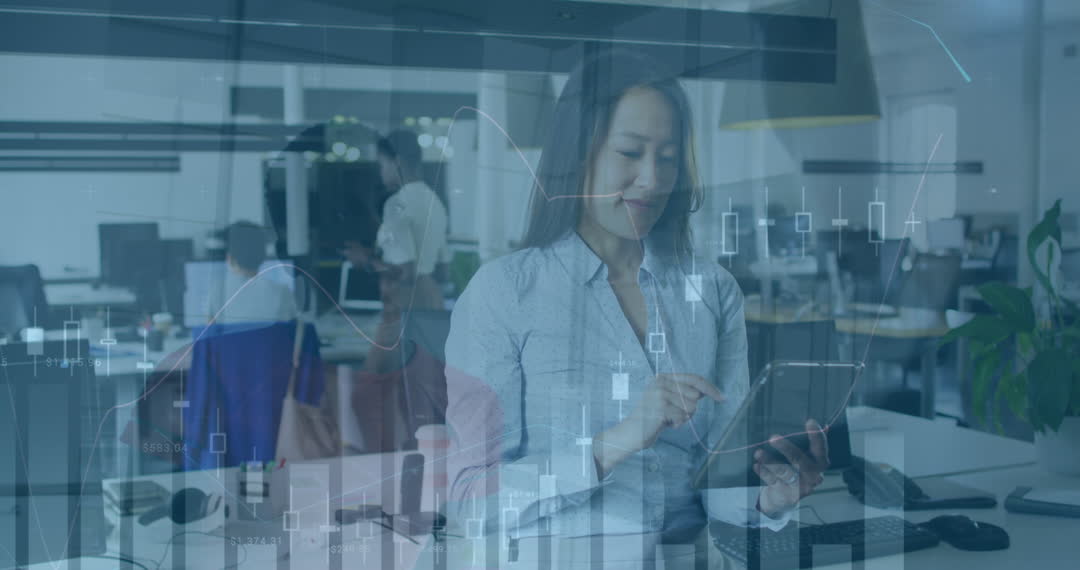 Office scene showing a diverse group interacting with digital financial data overlay. Woman using a tablet device as stock market charts and data points enrich the collaborative workspace. Ideal for illustrating technology roles in global business, finance, and business analytics enthusiasm.