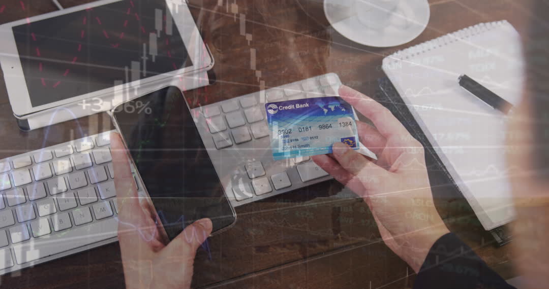 Visual fusion of digital finance technology with overlay of transaction themes, useful for articles or advertisements discussing modern fintech solutions, online payment systems, and global commerce trends. Ideal representation of techno-finance in digital marketing content.