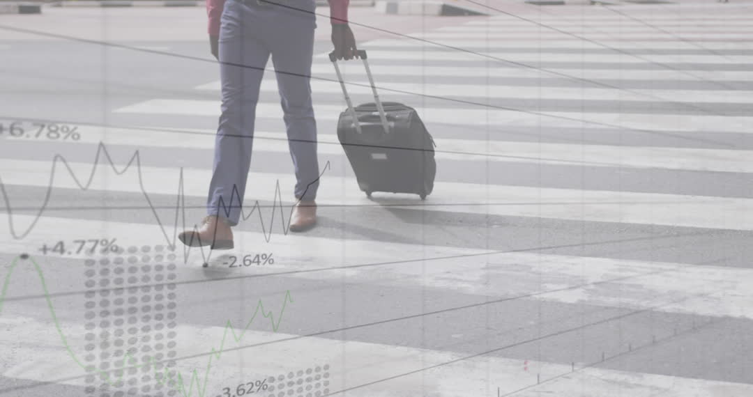Man pulling trolley bag across zebra crossing with transparent statistical data overlay suggests business travel intertwined with focused data analysis. Useful for illustrating business travel trends, financial statistics, or investment potential in commerce.