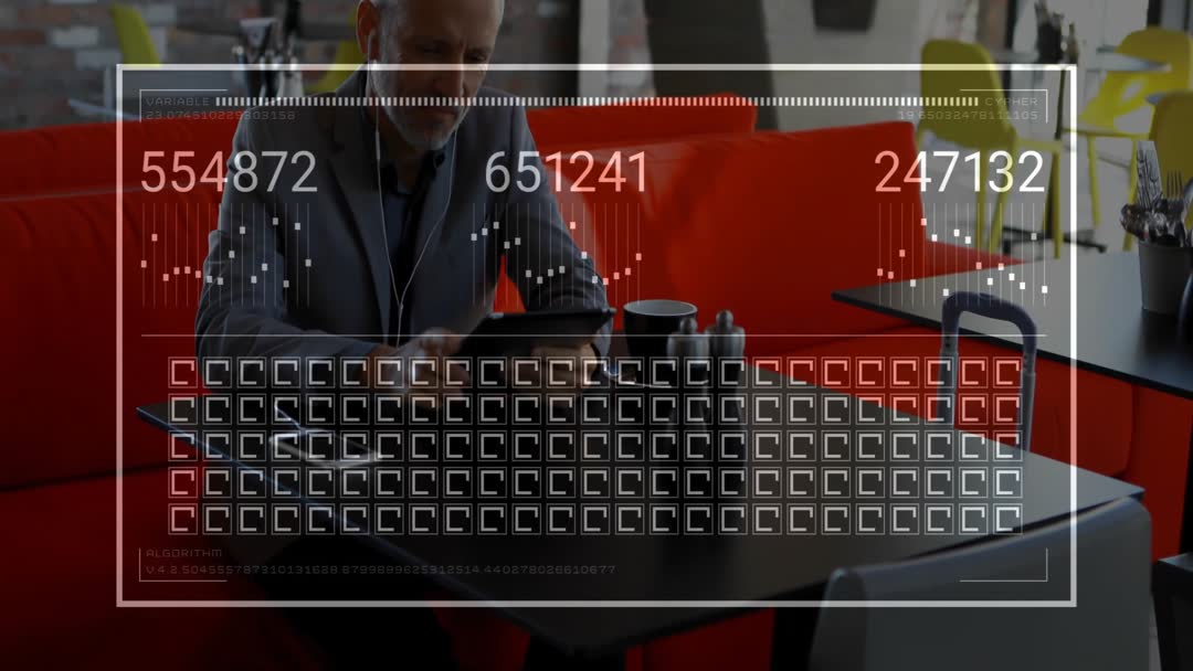 This stock video visually represents a business traveler examining financial data on a tablet while seated in a stylish cafe environment. The visible animation details finance-related graphics superimposed above him. Ideal for advertisements targeting investors, financial consultants, analysts, or travel businesspeople, as well as for websites or blogs discussing trends in remote work or financial analysis with modern digital interfaces.