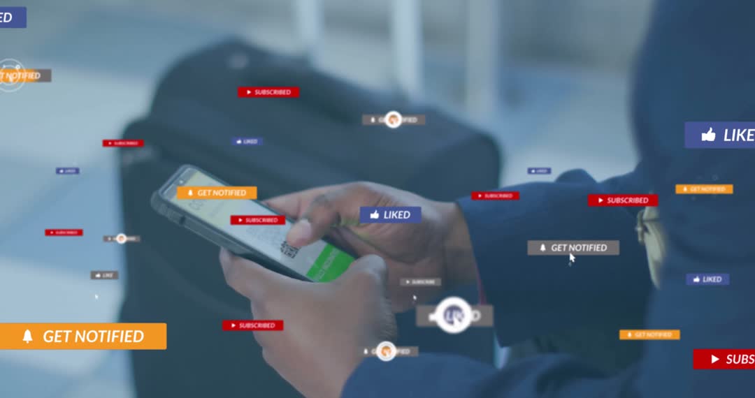This visual captures a business traveler interacting with his mobile phone while surrounded by digital and social media engagement icons. It spotlights the connection between digital technology and travel, illustrating seamless mobile connectivity even in transitional spaces like airports. Ideal for use in content related to modern communication techniques, technological advances in travel experiences, and digital marketing influence.