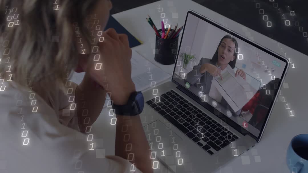 Video call features manager participating remotely in professional meeting as binary code floats over screen for tech-themed focus. Presenter flips documents to clarify data visually. Perfect for illustrating concepts like virtual connectivity, digital workspace innovations, and effective corporate communication strategies in tech contexts.