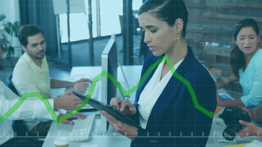 Businesswoman is using a digital tablet while analyzing financial data. Colleagues are collaborating in the office setting. Green graphs emphasize technology-driven insights. Perfect for themes of business strategy, teamwork, modern technology in professional environments, financial data analysis, and digital transformation in corporations.