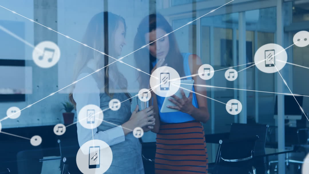 Two businesswomen review information on a tablet with digital network icons overlaying, suggesting analysis and collaboration in a modern office environment. Useful for themes of technology integration in business, teamwork using digital tools, and modern workplace communication.