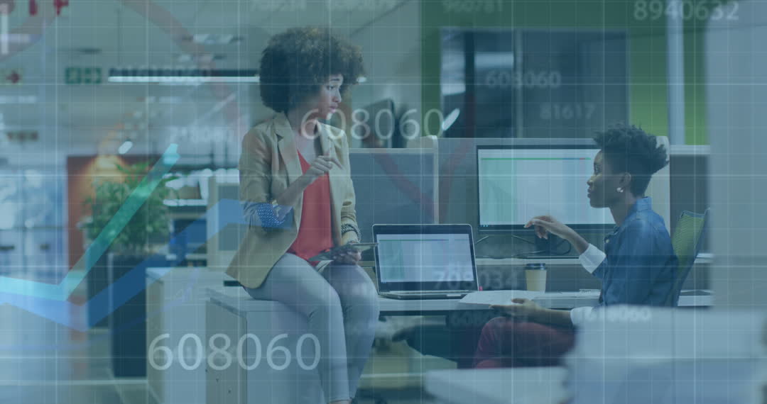 - Business Women Collaborating in High-Tech Office with Digital Overlay