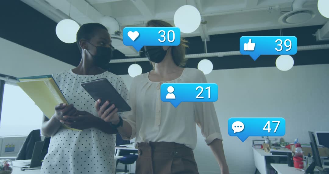 This is showcasing two professional women in an office environment using a digital tablet to engage with various analytics metrics. Icons indicating social media interactions float around them, enhancing the sense of teamwork and modern business dynamics. Useful for themes like collaboration, digital technology in businesses, and the impact of social media analytics on corporate success.