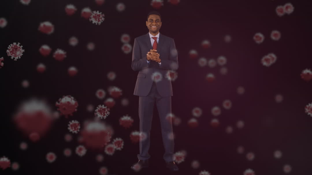 The video shows an african american businessman standing in a conceptual scene filled with floating coronavirus particles. This illustration is perfect for articles, presentations, or educational materials discussing the impact of COVID-19 on business and international health measures. The professional attire and medical theme effectively link economics and health crisis awareness.
