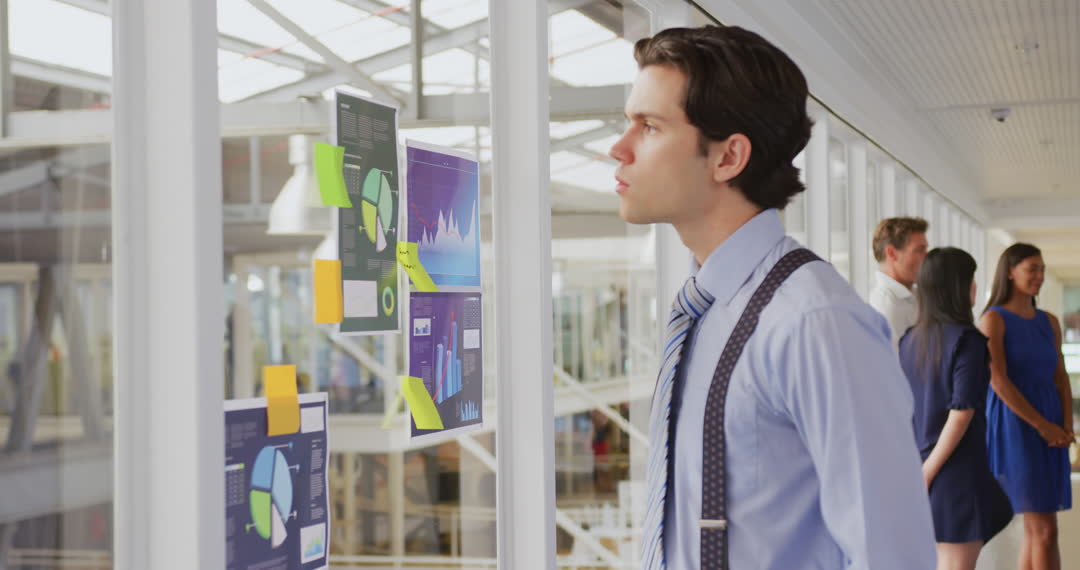 Traditional business professional examining analytics and charts on a wall during a conference. Group of people discussing in the background, conveying a professional and collaborative environment. Useful for illustrating business meetings, conferences, financial analysis, and corporate communication.