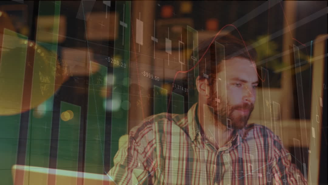 This depicts a businessman intently focusing on a computer screen set against overlaid graphs and data visuals. Highlighting themes of financial analysis, technology in business, and sophisticated data handling, this can be used for content focused on financial reporting, investment strategies, or modern workplace environments.