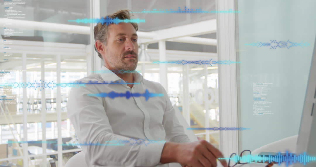 Middle-aged male professional focuses on digital data displayed on screen in sophisticated office environment. Useful for illustrating technology innovation, modern business settings or teamwork representations aimed at promoting productiveness, creativity, and cutting-edge advancements.