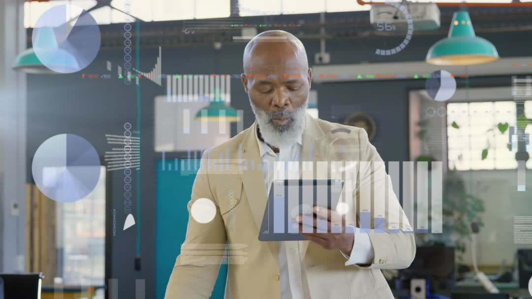 An African American businessman is engaged in analyzing data on a digital tablet within a modern, stylish office environment. Overlaid graphics show complex data analytics, including graphs and statistics. Ideal for use in topics related to technology in business, corporate data analysis, modern work environments, and innovative business solutions.