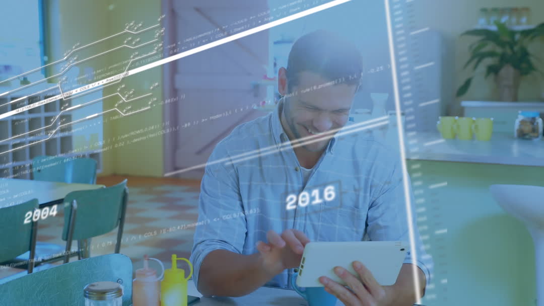 Businessman engages with a digital tablet in a modern cafe, adorned with dynamic data visuals and futuristic charts, emphasizing innovation and technology. This is ideal for illustrating concepts related to business analysis, mobile technology use, and digital transformation, as well as being suitable for articles about professionals utilizing data in everyday work settings.