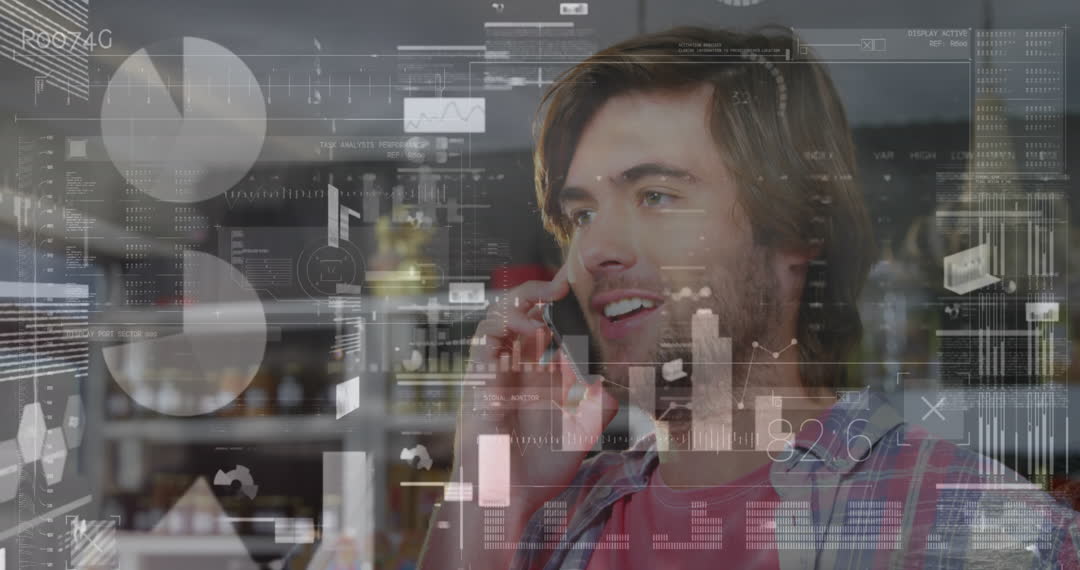 Illustrating a modern professional setting, with a man using a smartphone amidst an overlay of complex data graphics. This embodies the fusion of traditional communication and advanced data analysis technology. Ideal for conveying themes related to digital transformation, global business operations, and tech-savvy strategies in corporate environments.