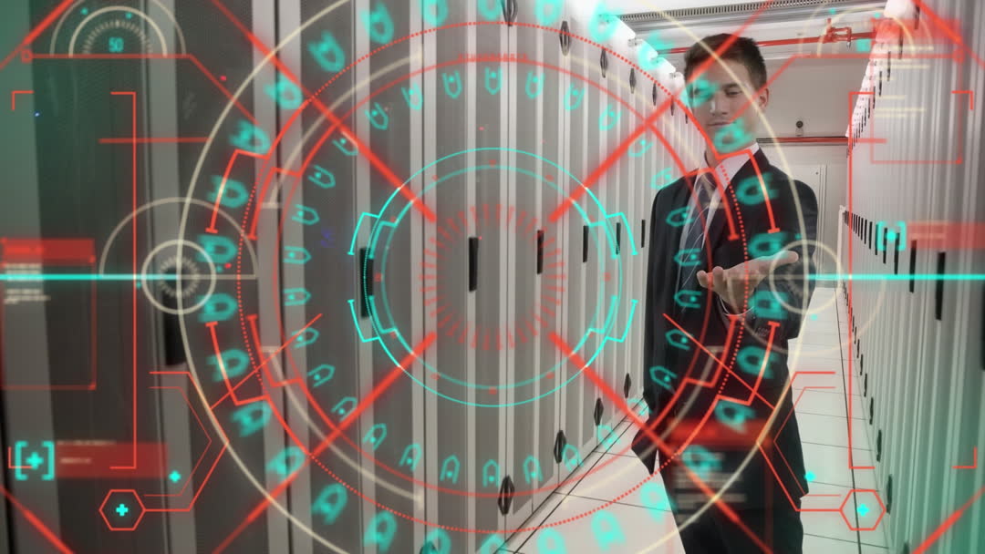 Depiction of businessman engaged with digital data processing concepts pertinent for illustrating themes around cyber security, technology advancement, and business operations in server environments. Ideal for marketing materials, educational resources, or technology-focused content emphasizing security and innovation.