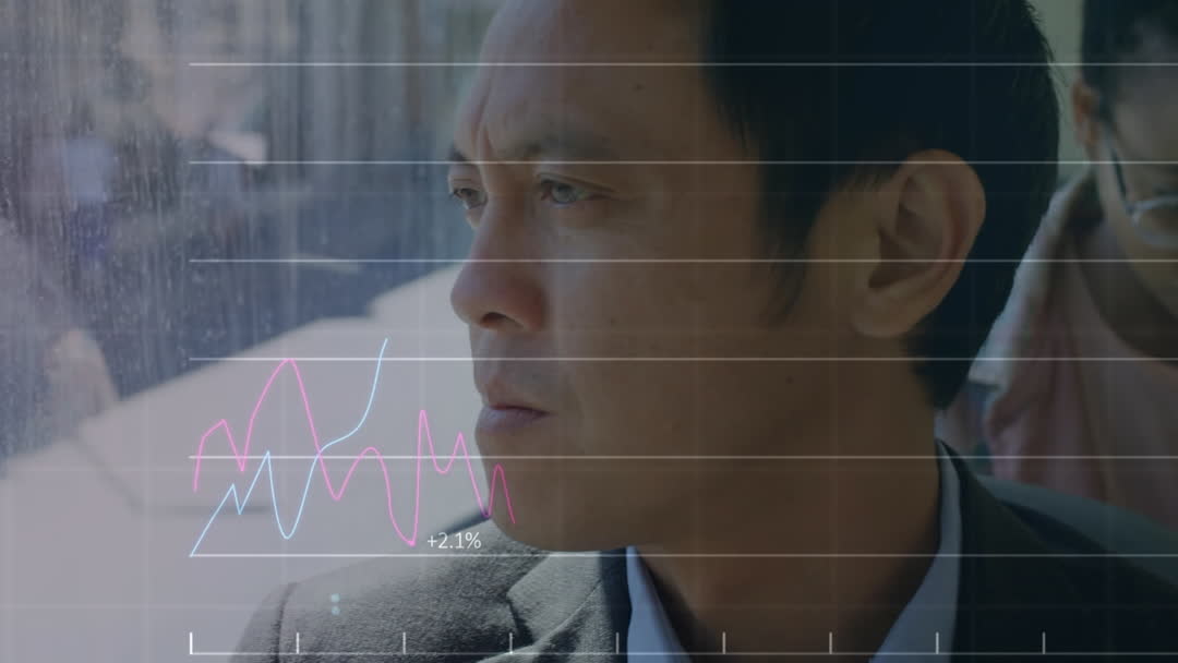 A businessman is shown using a virtual reality headset while analyzing financial data represented by animated line graphs. This video is useful for illustrating concepts related to digital transformation, emerging technologies in business, and advanced methods for financial analysis. It is suitable for articles, presentations, and marketing materials on tech integration in corporate environments.