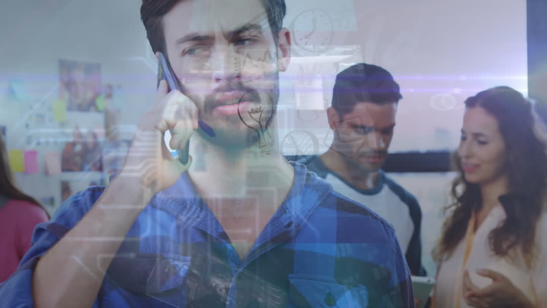 Businessman communicates using a smartphone while digital holographic data overlays create a futuristic atmosphere in a bustling office. This can be used in content about modern business practices, workplace technology, data-driven decision making, and the integration of digital tools in professional settings.