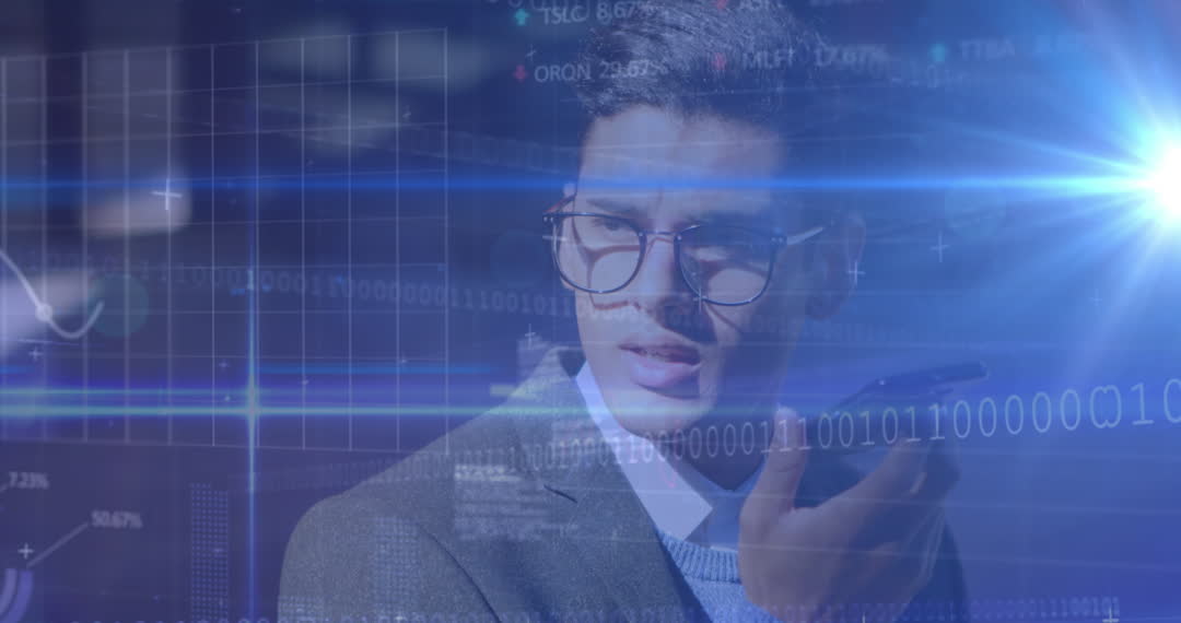 Caucasian businessman using smartphone while digital graphs and binary codes overlay his video. Concept of data analysis and communication in the finance industry, representing technological innovation. Useful for content on digital platforms in business communication, financial services, and technological advancements.